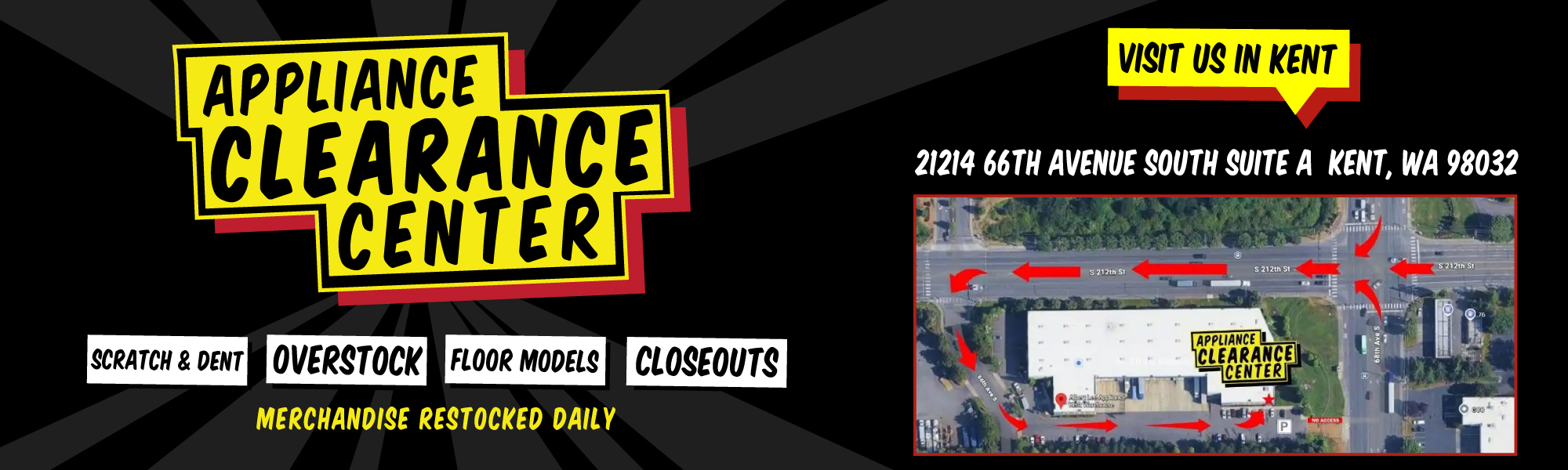 Just minutes north of the Kent Station Shopping Center on the corner of 212th and West Valley Highway near the CORT Furniture Outlet, our Kent appliance clearance center is full of deals, the biggest brands, and the best selection of low price appliances in the area. Heads-up! We’re located within the same building as the Albert Lee Kent warehouse. To find the deals, visit our clearance center located in Suite A!