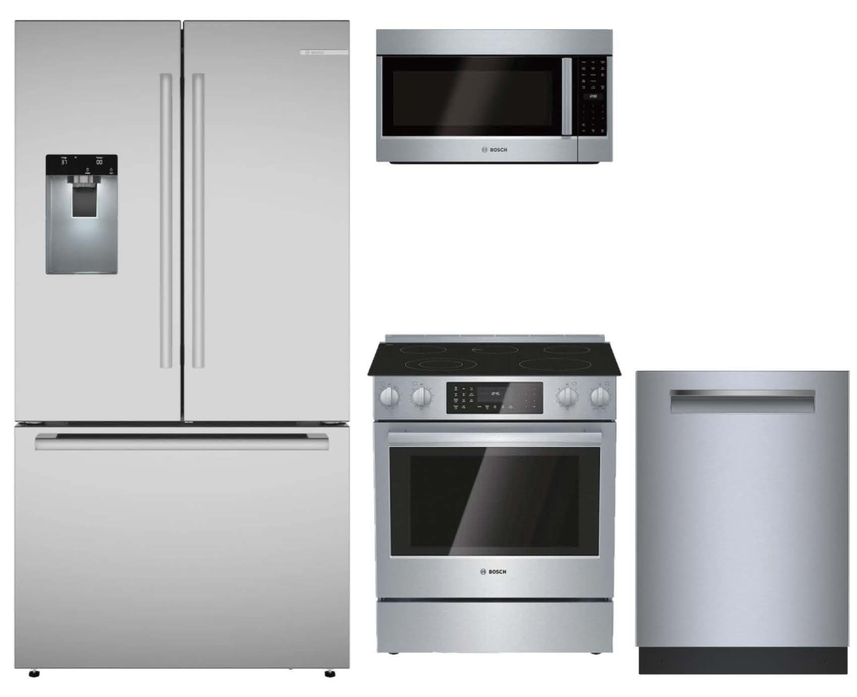 Bosch 4 Piece Stainless Steel Kitchen Package with a French door refrigerator, over the range microwave, built in dishwasher, and slide in electric range.Read More