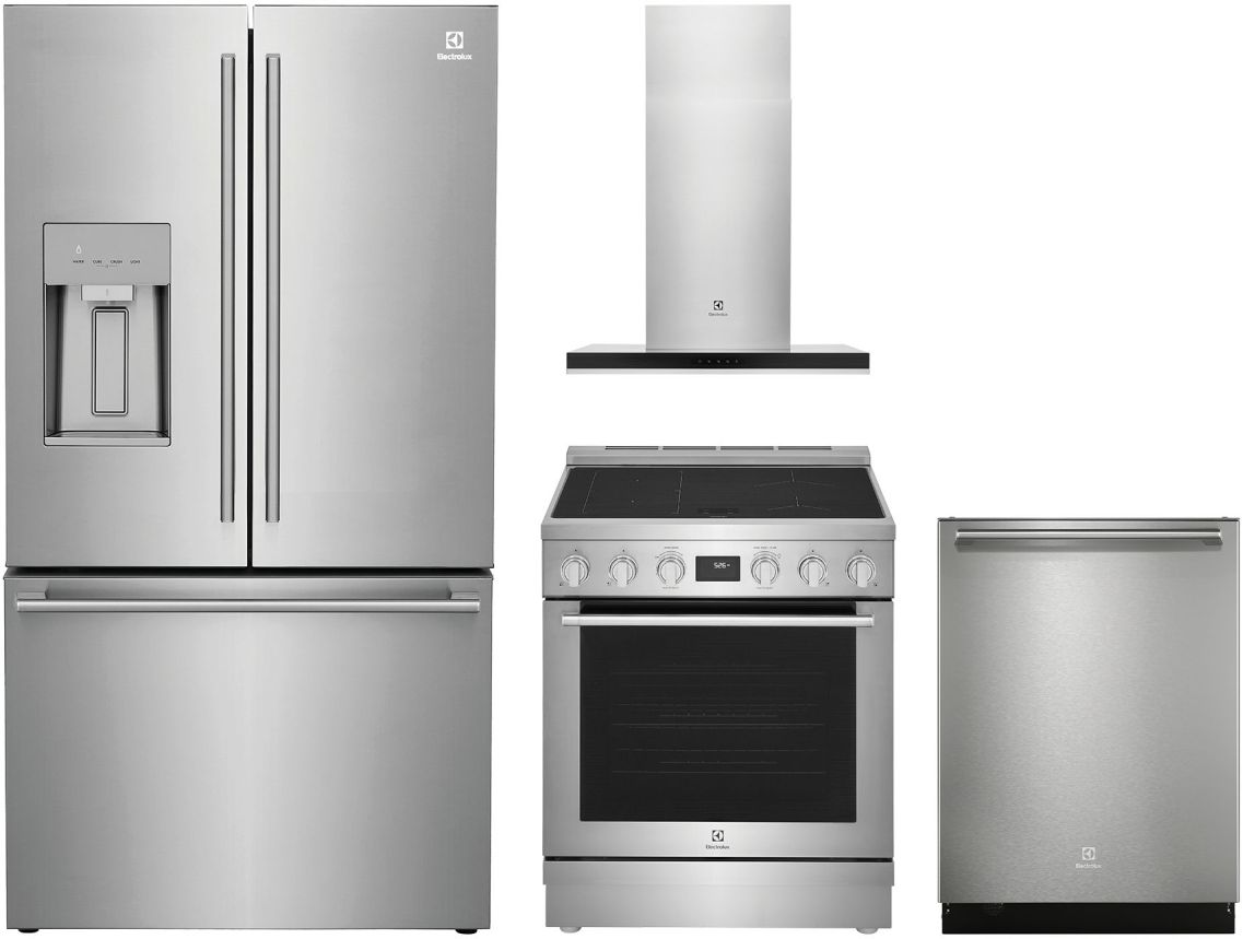 The Electrolux 4 Piece Stainless Steel Kitchen Appliance Package with a French door refrigerator, induction range, built in dishwasher, and wall mounted range hoodRead More