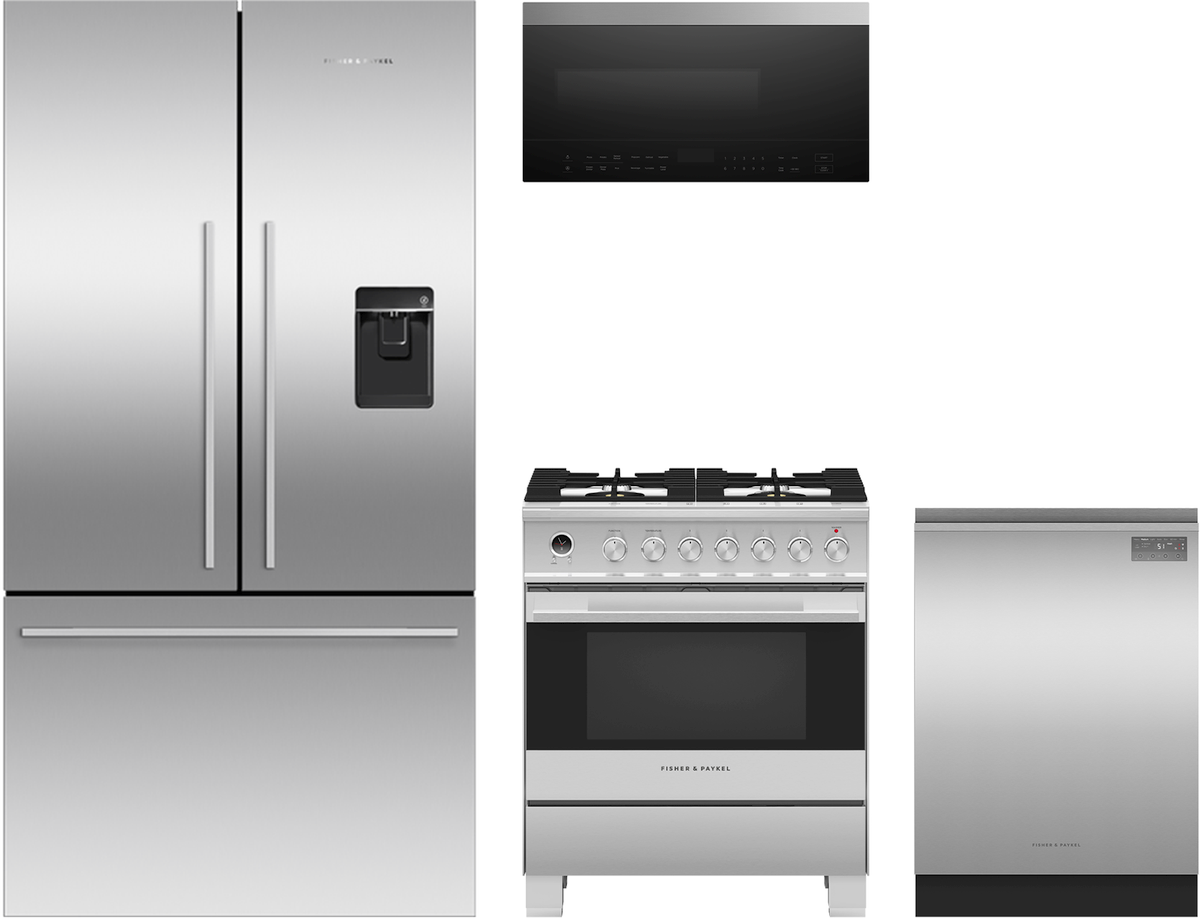 Fisher & Paykel 4 Piece Kitchen Appliance Package with a french door refrigerator, pro style dual fuel range, drawer dishwasher and over the range microwave.Read More