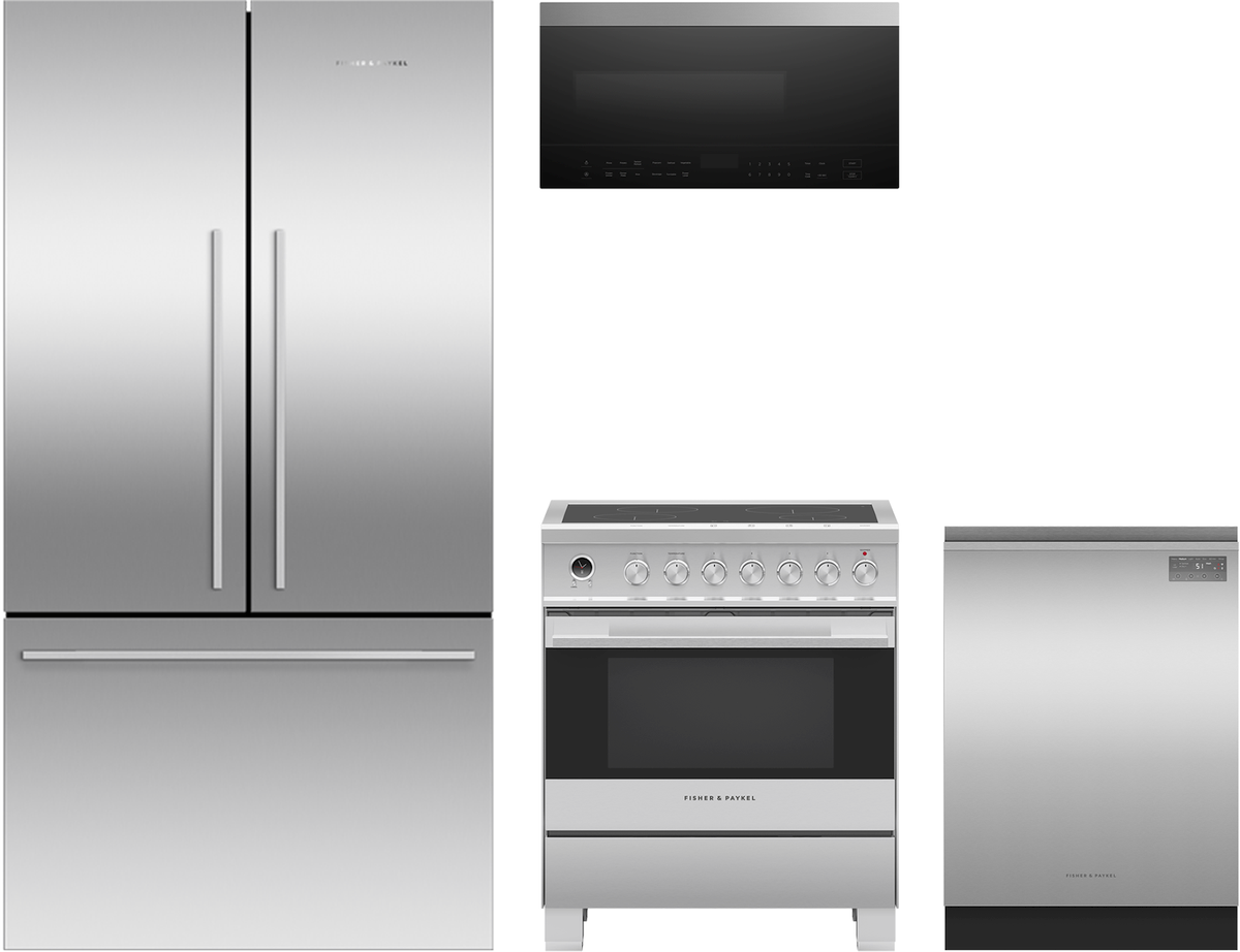 Fisher & Paykel 4 Piece Kitchen Appliance Package with a French door refrigerator, pro style induction range, drawer dishwasher and over the range microwave.Read More