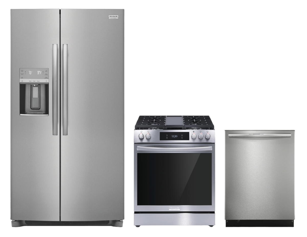 Frigidaire Gallery® 3 Piece Smudge-Proof® Stainless Steel Kitchen Package with side-by-side refrigerator, freestanding gas range, and built in dishwasher.Read More