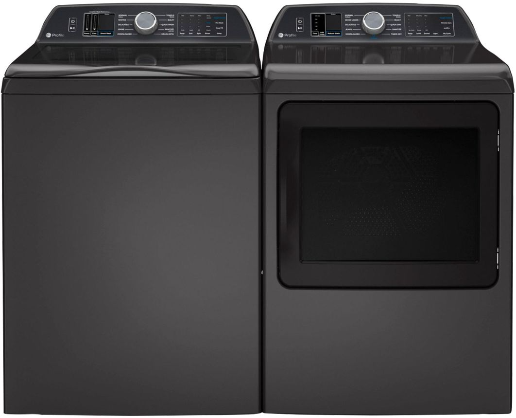 GE Profile™ Diamond Gray Laundry Pair with a 5.4 cu. ft. capacity top load washer and a 7.4 cu. ft. capacity front load electric dryer.Read More