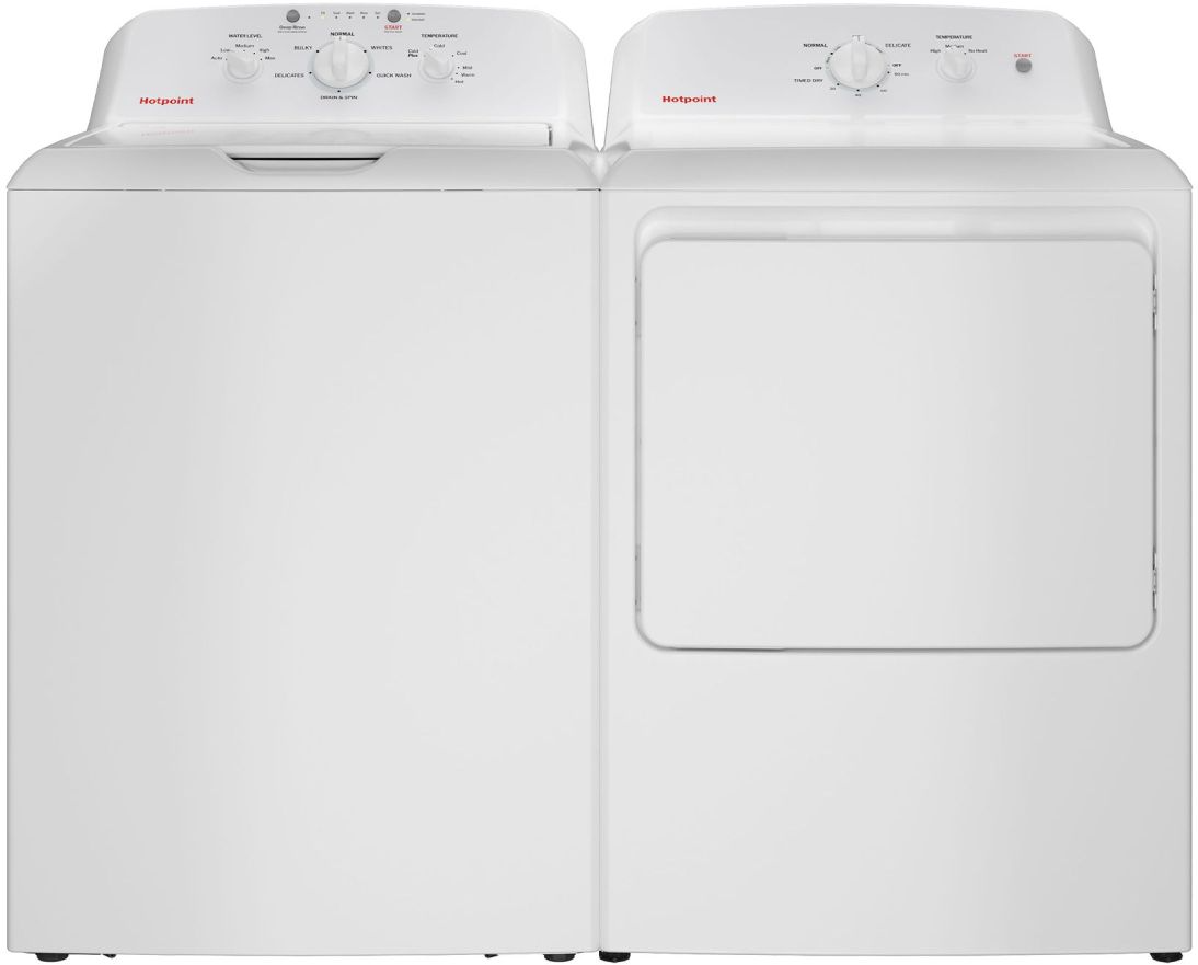 Hotpoint® White Laundry Pair with a 4.0 cu. ft. capacity top load washer and a 6.2 cu. ft. capacity front load gas dryer.Read More