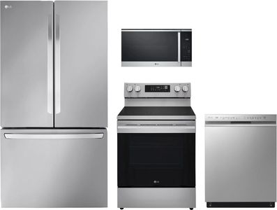 LG 4 Piece Stainless Steel Kitchen Package with Counter Depth French Door Refrigerator, Freestanding Electric Range, Built In Front Control Dishwasher, and Over The Range Microwave.Read More