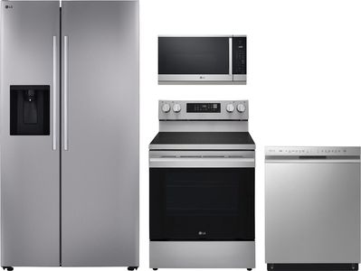 LG 4 Piece Stainless Steel Kitchen Package with Side-by-Side Refrigerator, Freestanding Electric Range, Front Control Built In Dishwasher, and Over The Range Microwave.Read More