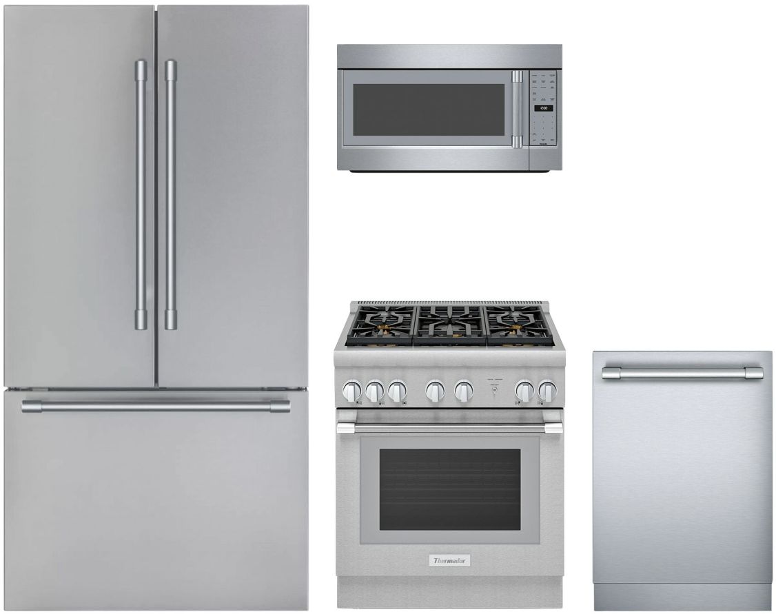 Thermador® 4 Piece Stainless Steel Kitchen Package with a french door refrigerator, built in dishwasher, pro style gas range and over the range microwave.Read More