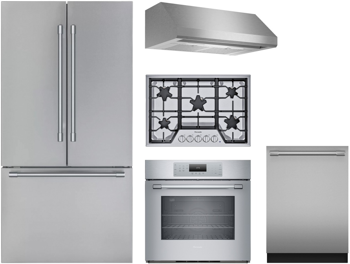 Thermador® 5 Piece Stainless Steel Kitchen Package with counter depth French door refrigerator, top control built in dishwasher, natural gas cooktop, single electric wall oven, and an under cabinet range hood.Read More