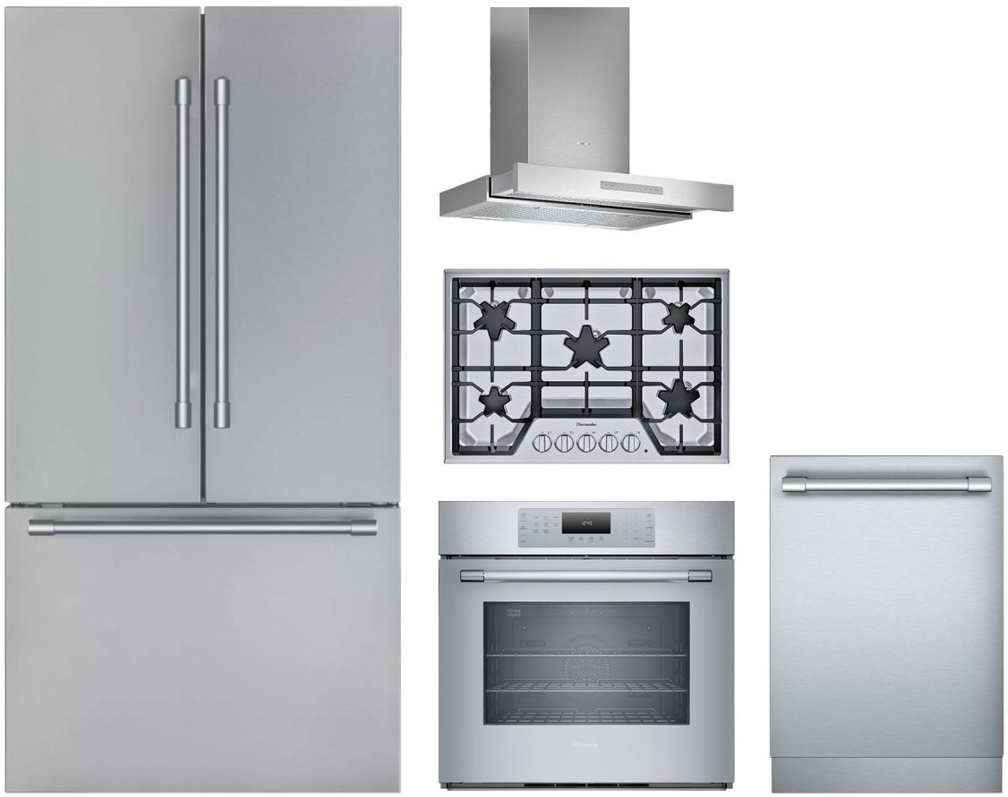 Thermador® 5 Piece Stainless Steel Kitchen Package with a french door refrigerator, built in dishwasher, wall oven, cooktop, and wall hood.Read More