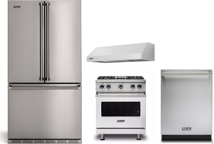 Viking® 4 Piece Stainless Steel Kitchen Package with a french door refrigerator, pro style gas range, built in dishwasher, and range hoodRead More